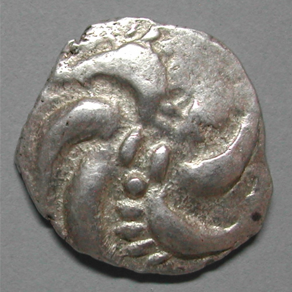 RS: Pferdchen galoppiert nach links, losgelöste Punkmähne, Schnabelkopf, davor ✣, oben 2 Torques, unten ⪥?