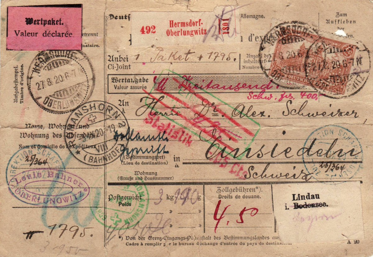Sehr interessant, Zollgebühren 4,50 Handvermerk, Wert 3’000 wohl Reichs Mark