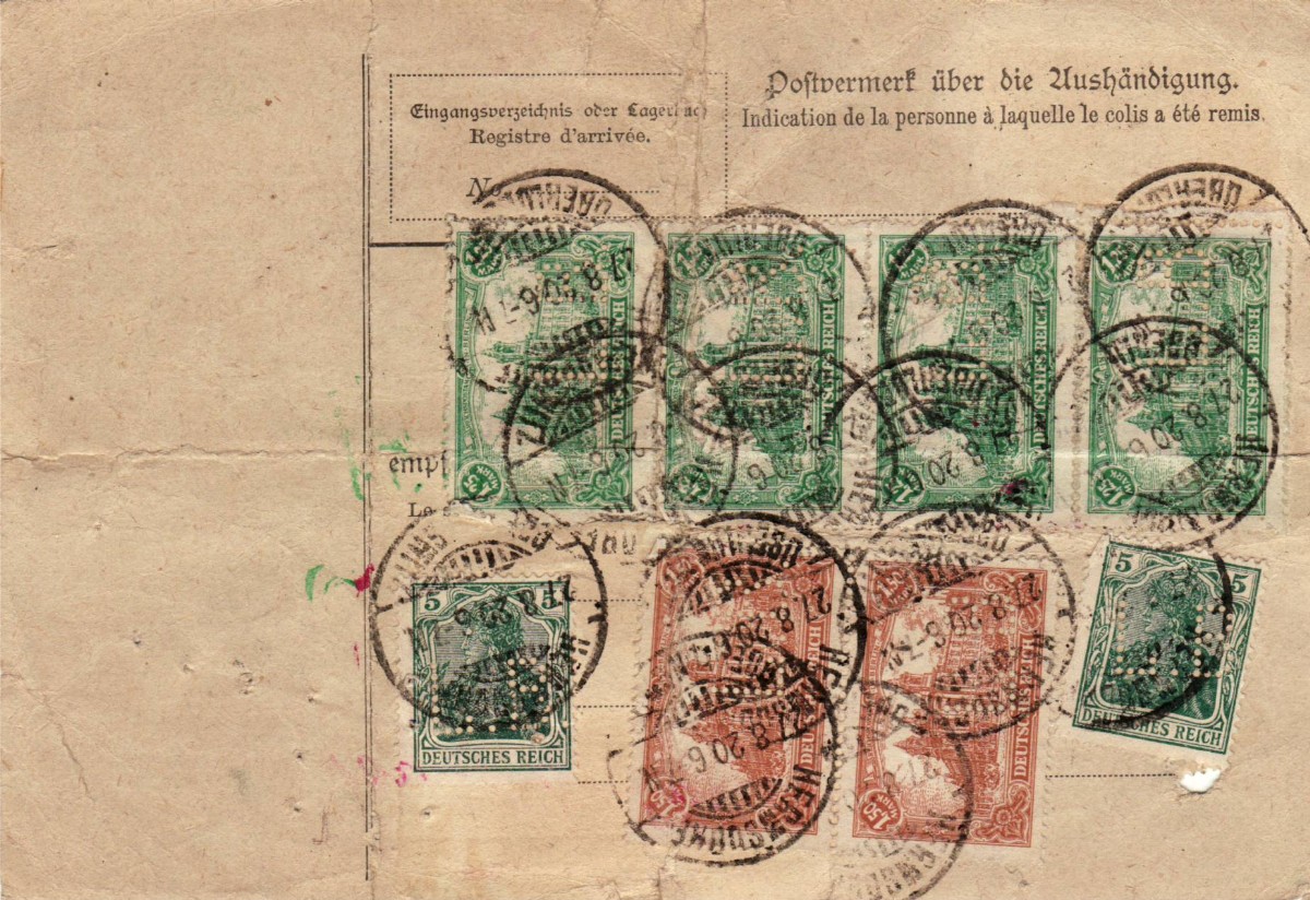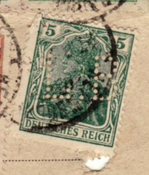 RS: Buntfrankatur, 2 x Germania 5 grün, 2 x 1,50 MARK braun und 4 x 1,25 MARK grün alle Perfin L.B.