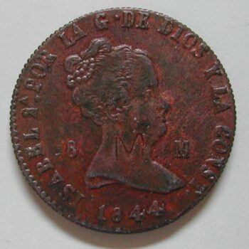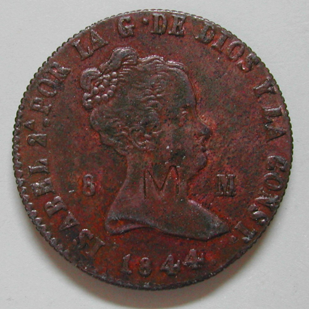 AS: ISABEL 2A. POR LA G•DE DIOS Y LA CONST• 1844, Kopf mit hochgesteckter Frisur nach rechts zwischen 8 – m, grosses M im Hals eingepunzt