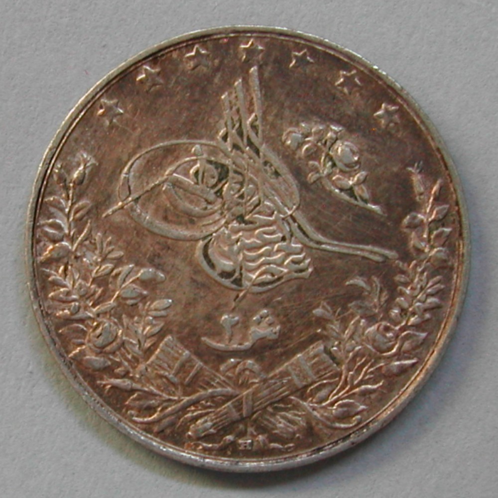RS: 7 Sterne über Thugra (Signatur des Sultans) rechts Rose, unten 2 gekreuzte Kanonen und Rosenzweige, unten: H