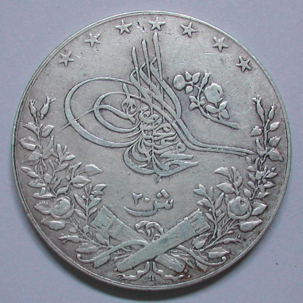 AS: 7 Sterne / Tughra mit Rose rechts / Wert 20 Q, / 2 gekreuzte Kanonen und Blumenzweige