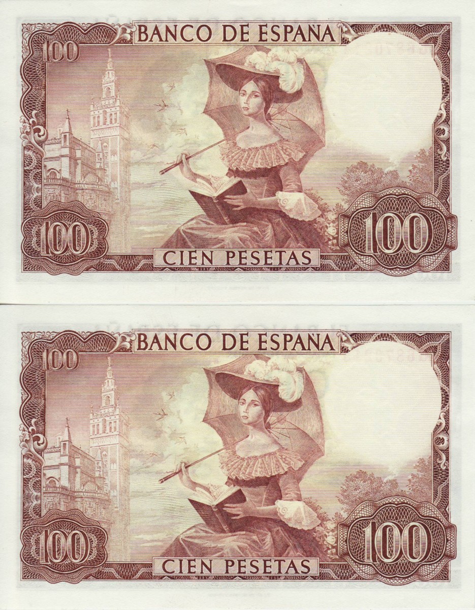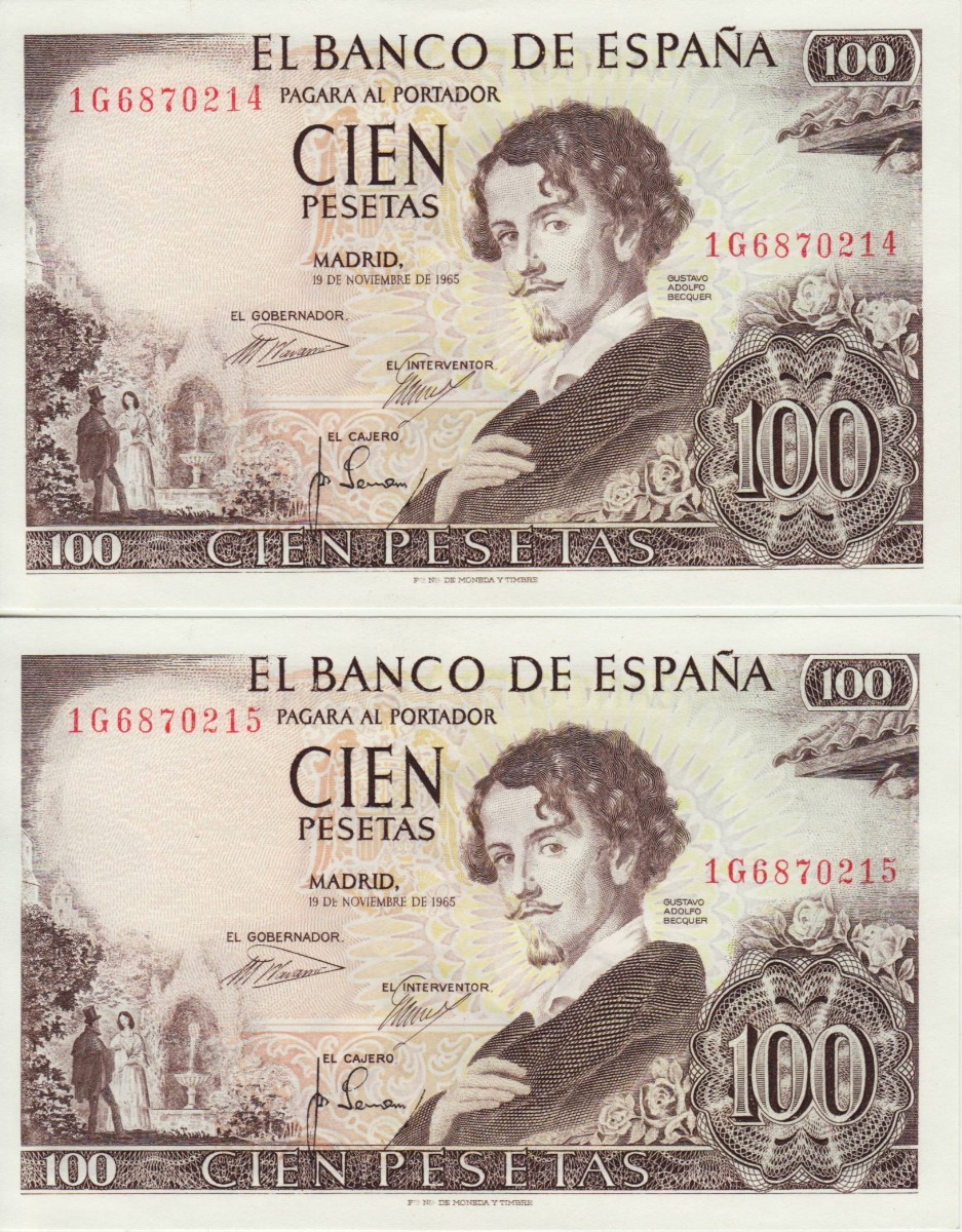 AS: EL BANCO DE ESPAÑA, BÜSTE DES GUSTAVO ADOLFO BECQUER, 2 x rote Nr: 1G6870214 + 1G6870215