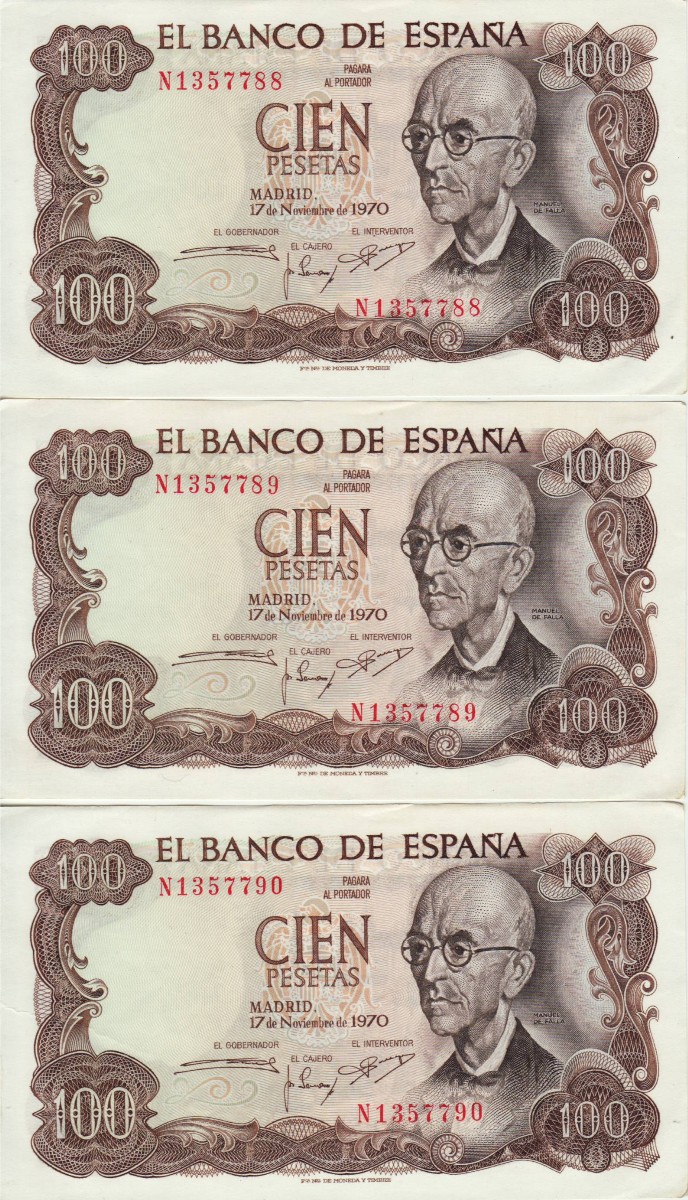 AS: EL BANCO DE ESPAÑA, rechts Büste des MANUEL DE FALLA, 2 rote Nr: N1357788 / 89 / 90
