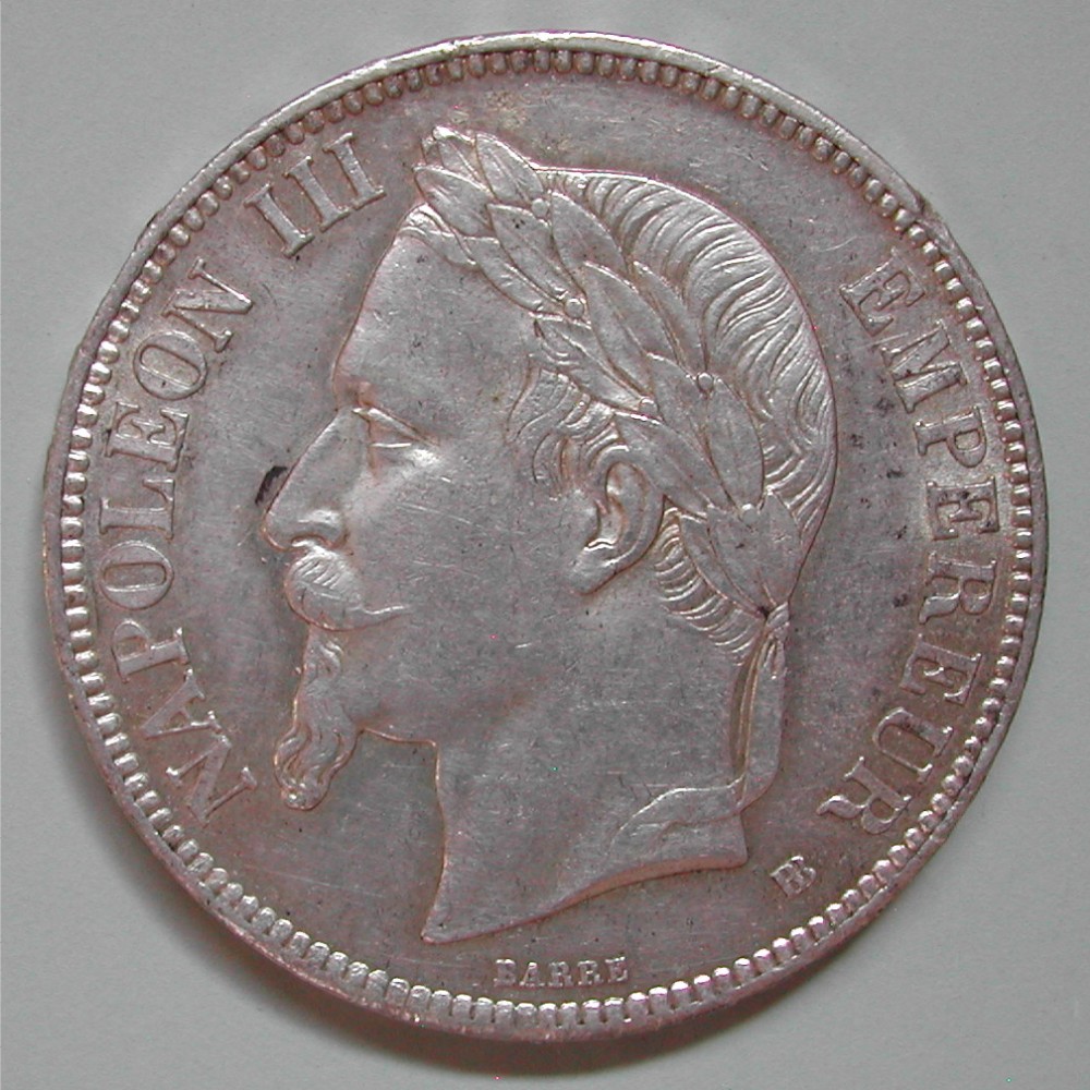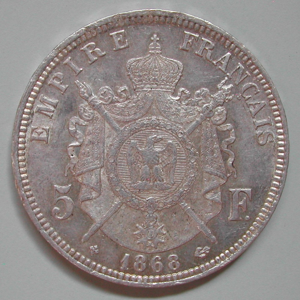 RS: EMPIRE – FRANÇAIS, kaiserliche Embleme zwischen 5 – F. unten: ✥ 1868 ⚓︎