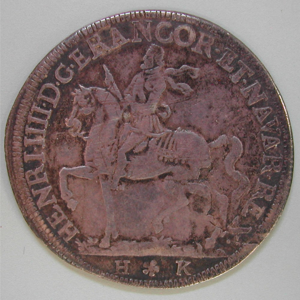 AS: HENRI•IIII•D•G•FRANCOR•ET•NAVAR•REX•, der König nach links reitend, in Ex: H ✿ K