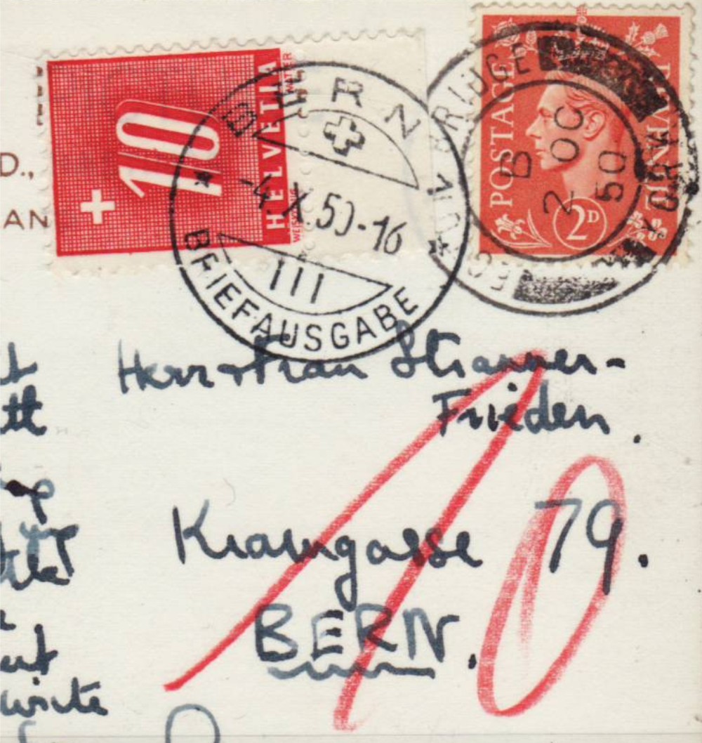 RS: 2 d Marke ⊙ B / 2 00 / 50 (FEHLER: müsste 2 / 10 / 50 heissen)!!, CH Strafporto 10 rot, ⊙ -4.X.50-10, roter Taxvermerk 10