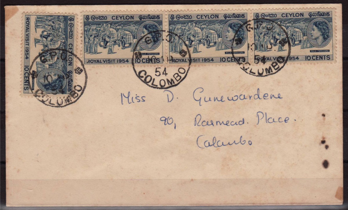 AS: 4 Marken blau, CEYLON 3-sprachig, Szene der Elephanten-Perahera, im Oval Q.E.II., ROYAL VISIT 1954, 10 CENTS