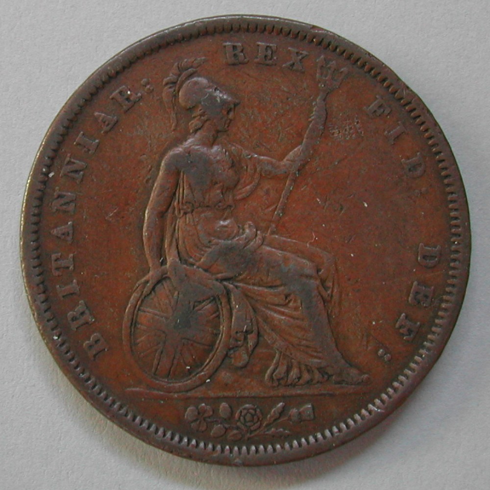 RS: BRITANNIAR : REX FID : DEF :, Britannia nach rechts sitzend, hält Schild und Trident, in Ex: Rose