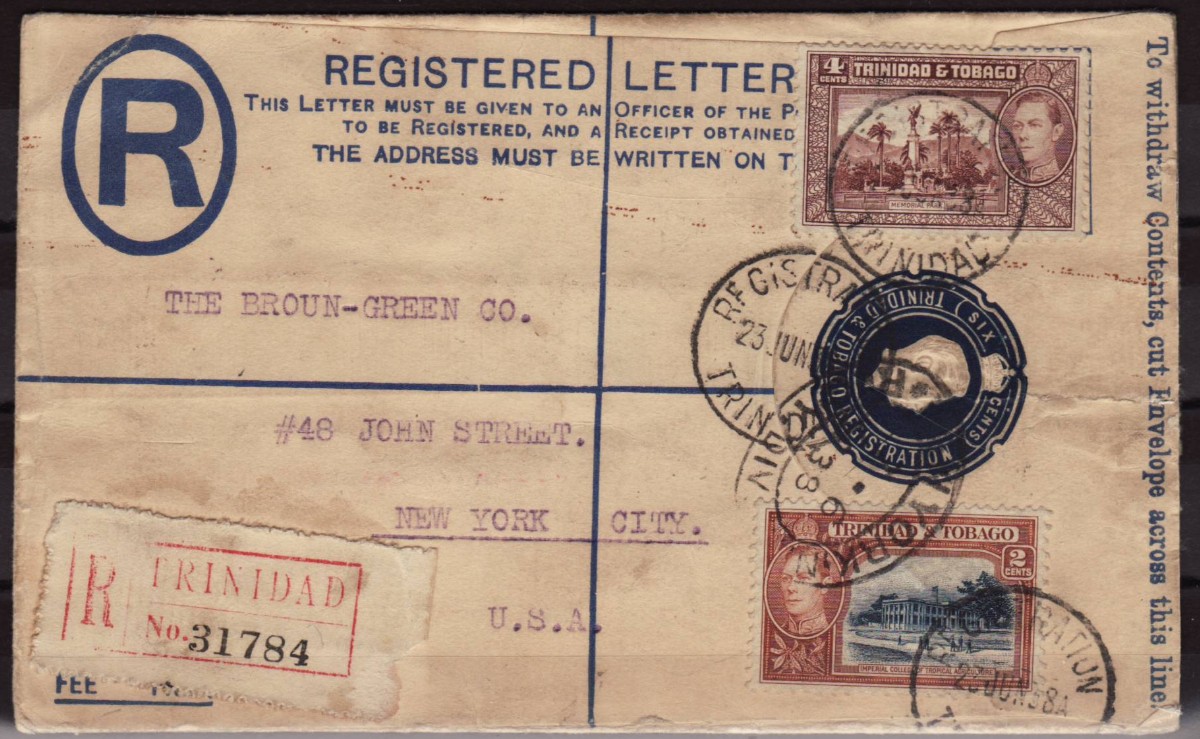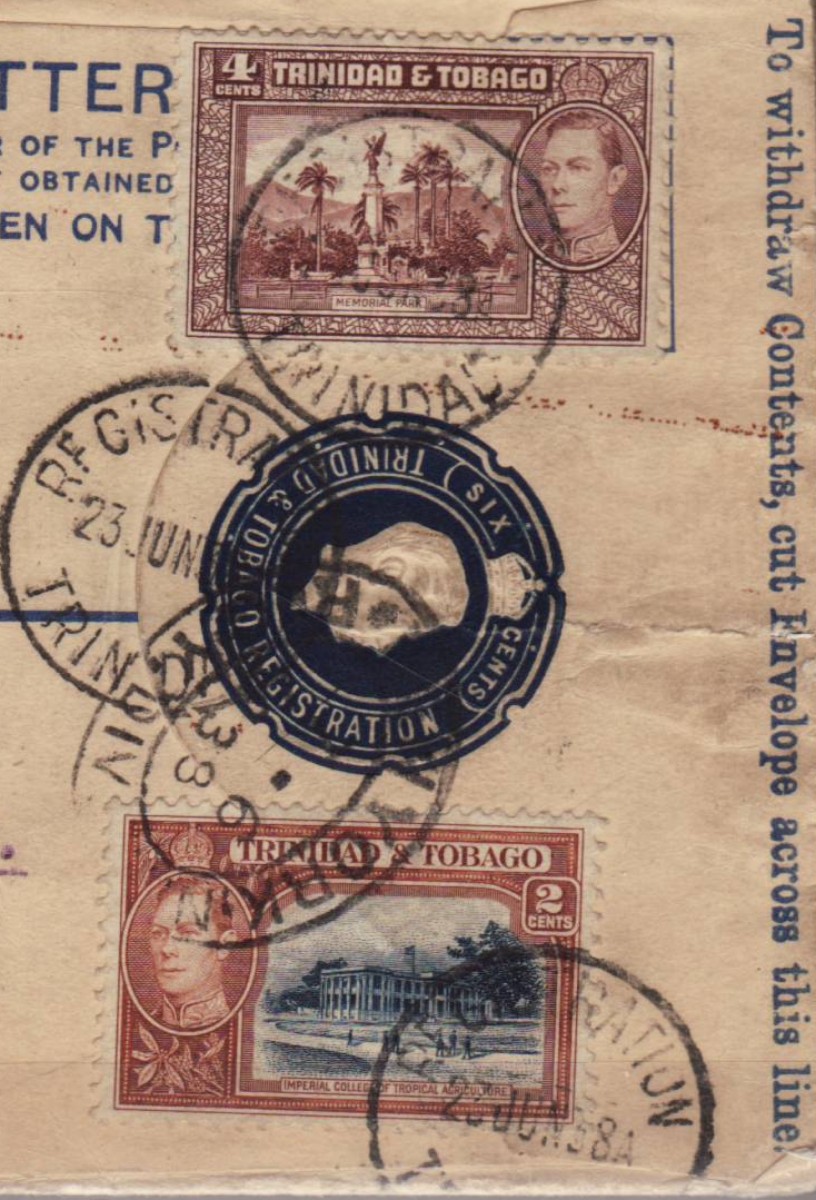 AS: REGISTERED LETTER R, TRINIDAD N° 31784, GS: SIX CENTS + 2 Zusatzmarken 1 und 4 CENTS