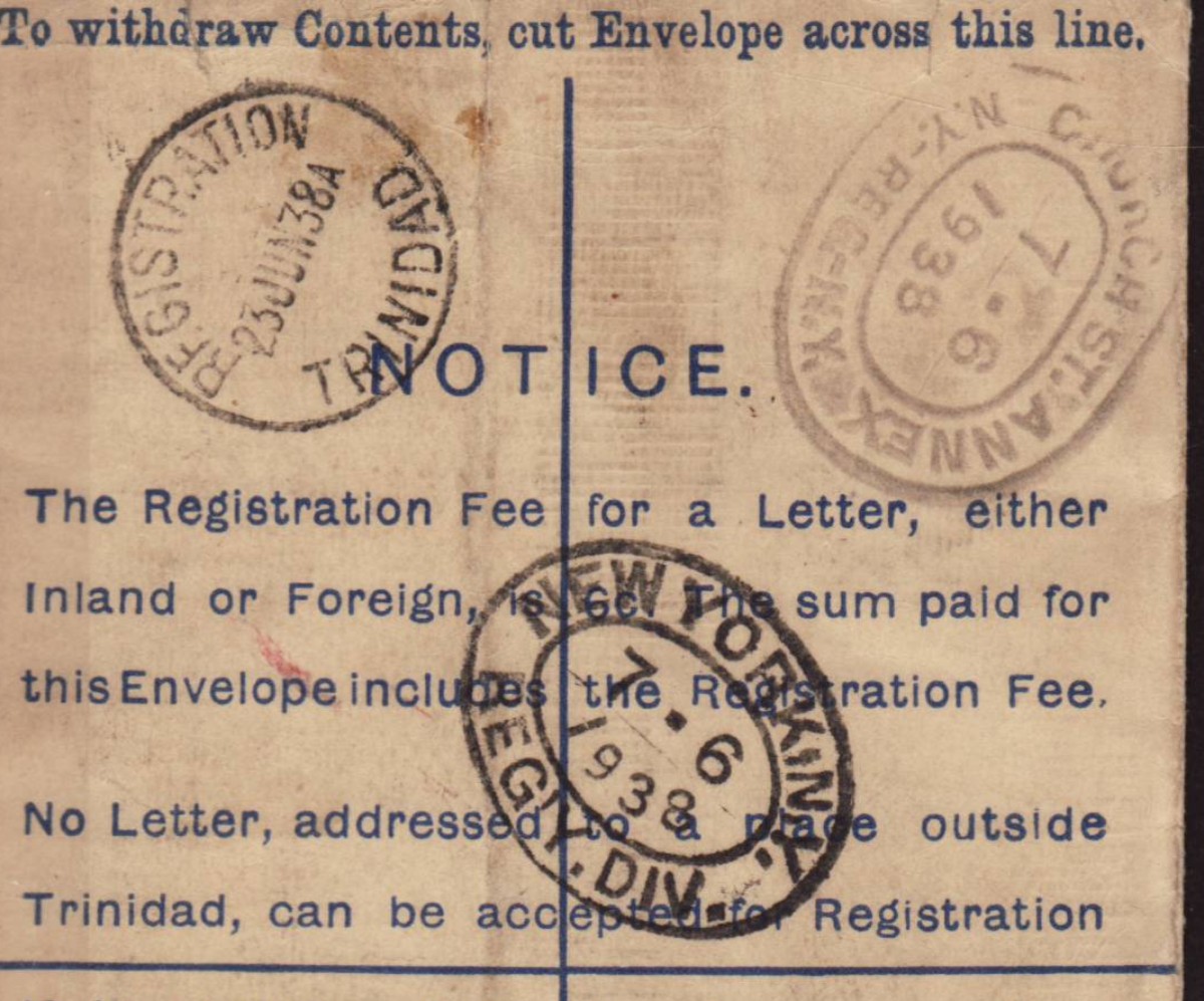 RS: Text mit Anleitung zum Gebrauch eines R-Briefes, Absender und 3 Stempel TRINIDAD + NYC