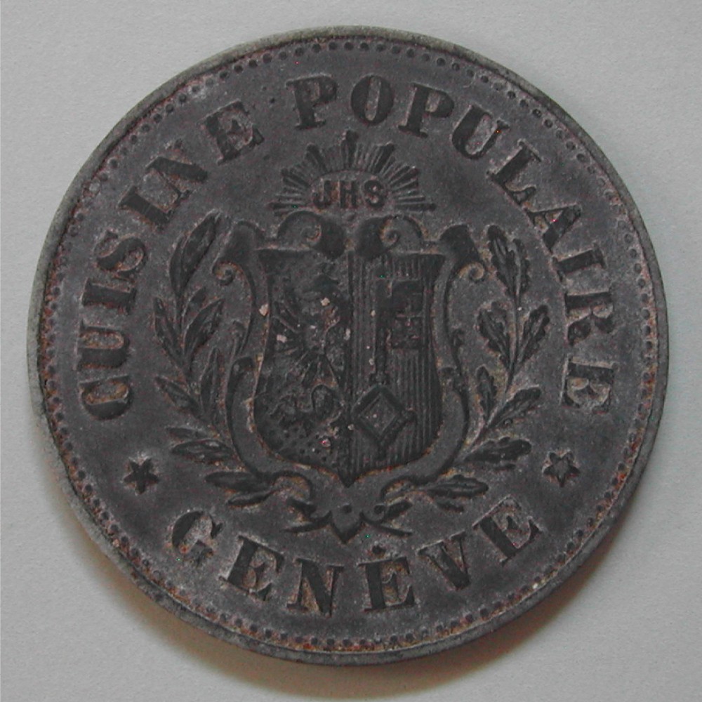 AS: CUISINE POPULAIRE ★ GENÈVE ★, Genfer Wappen unter strahlendem IHS zwischen Lorbeer-und Eichenzweigen