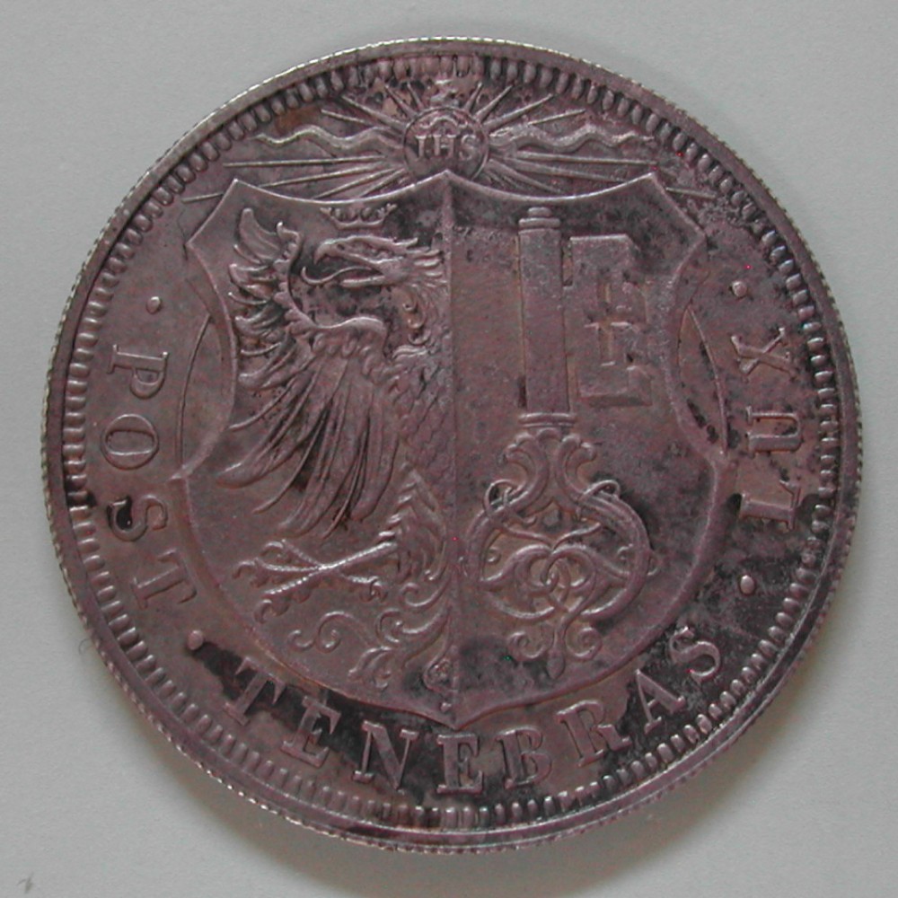 AS: • POST • TENEBRAS • LUX •, strahlende Sonne mit IHS über Wappen