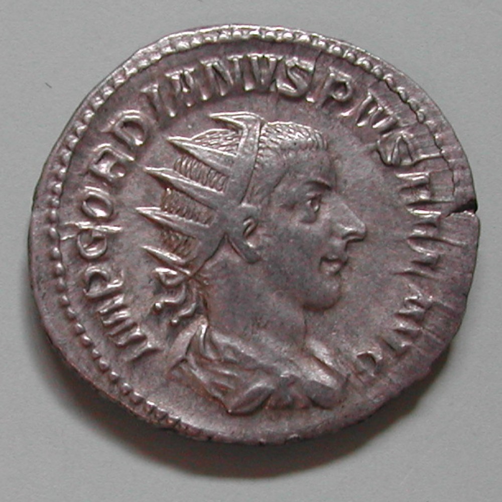 AS: IMP GORDIANVS PIVS FEL AVG, Kopf mit Strahlenkrone nach rechts, Perlkreis