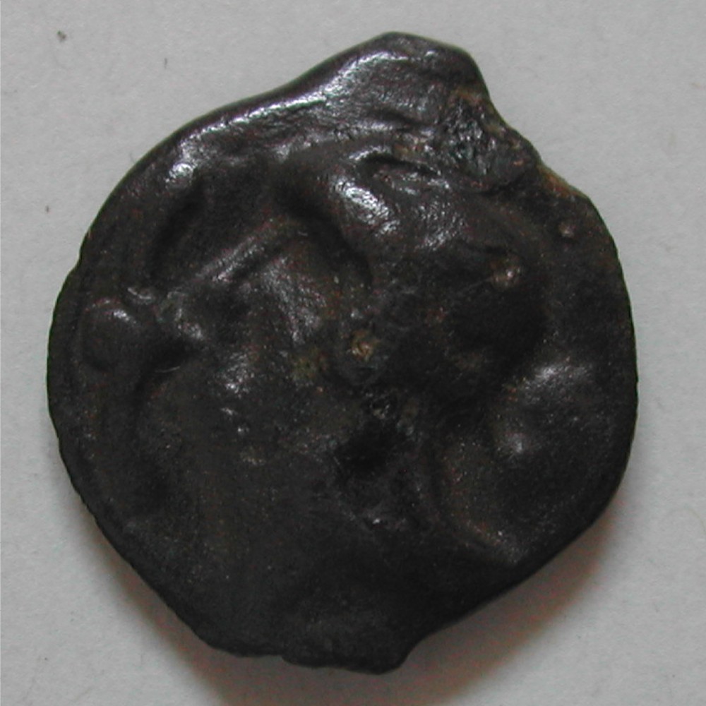 AS: Kopf mit Helm und Haarwulst nach links, vor dem Mund Lilie, rechts Torques (?)