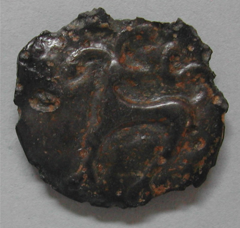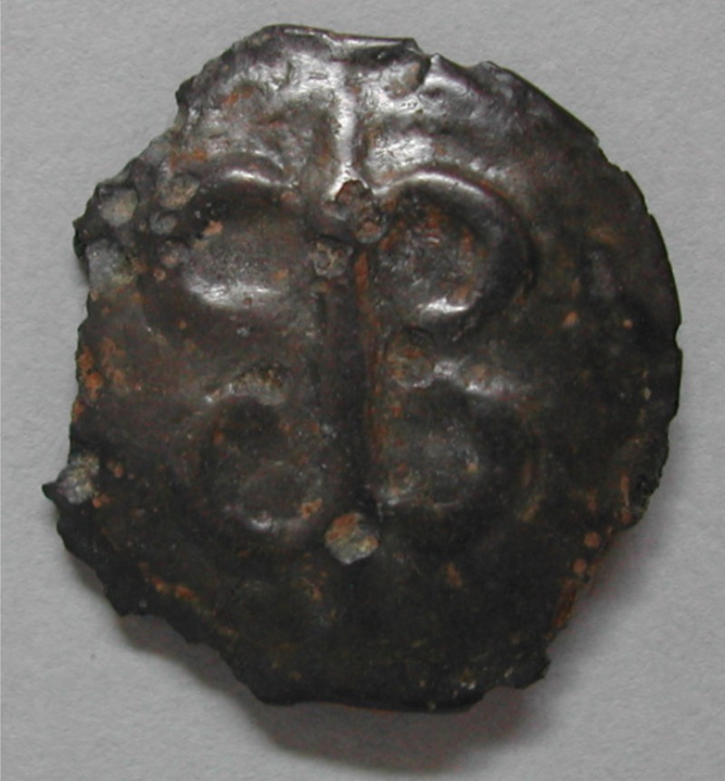 Schwarz-grünliche Patina, glänzend, Rand etwas zackig