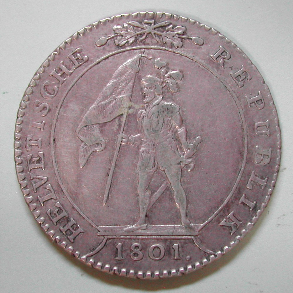 AS: HELVETISCHE – Zweige – REPUBLIK, in Ex: 1801., Landsknecht mit Fahne und Schwert nach links stehend, Linienkreis