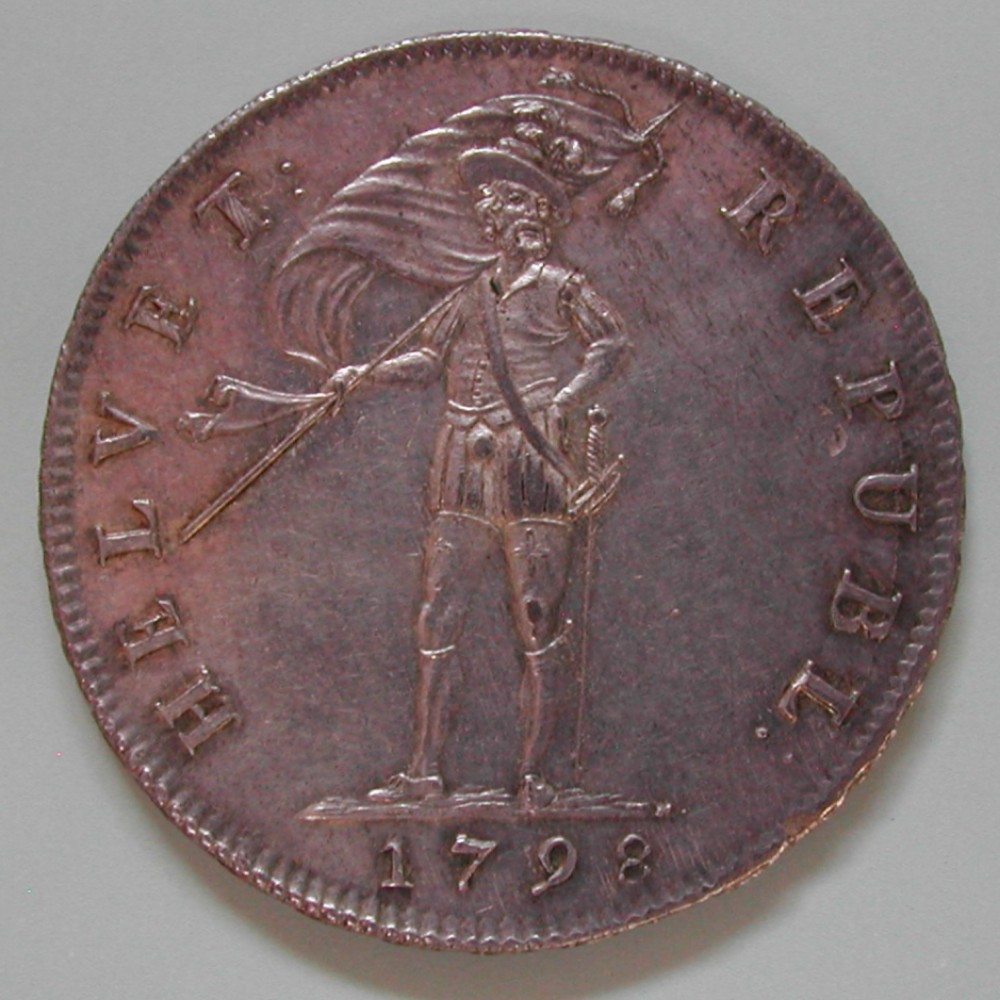 AS: HELVET : – REPUBL : 1798, Landsknecht mit wehender Fahne nach links stehend und rechts blickend, unteres Ende der Fahnenstange bei L (!)