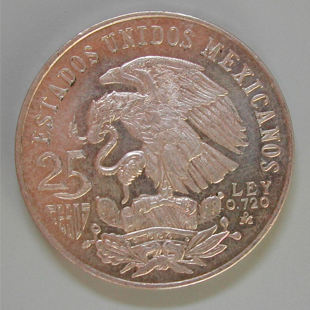 AS: ESTADOS UNIDOS MEXICANOS, Adler mit Schlange auf Kaktus, darunter Zweige, links: 25 / PESOS, rechts: LEY / 0.720 / °M