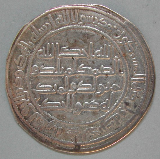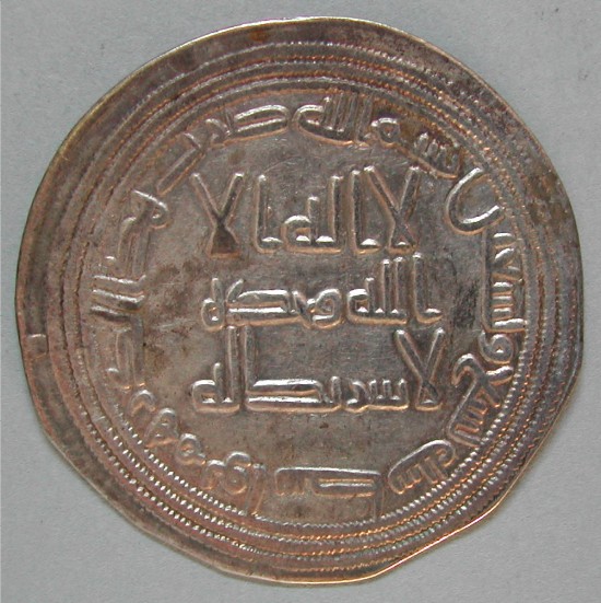 AS: Umschrift: Im Namen Allahs, dieser Dirhem wurde geschlagen in Al-Wasit im Jahr 99, im Feld: Es gibt nur einen Gott, er hat keine Partner