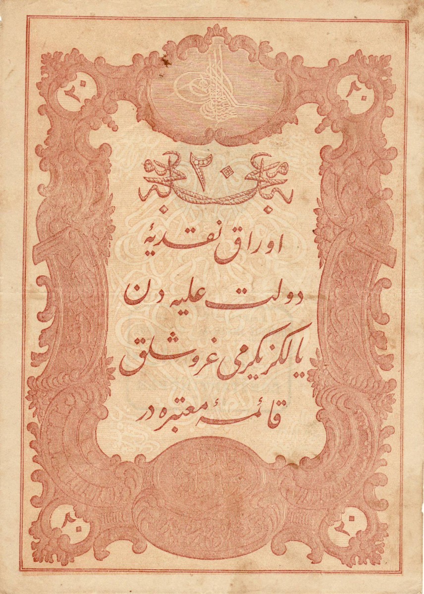 AS: Toughra oben in ovaler Kartusche, 20 Kuruș verschnörkelt, unter Wertangabe: 4 Zeilen Schrift in barockem Rahmen