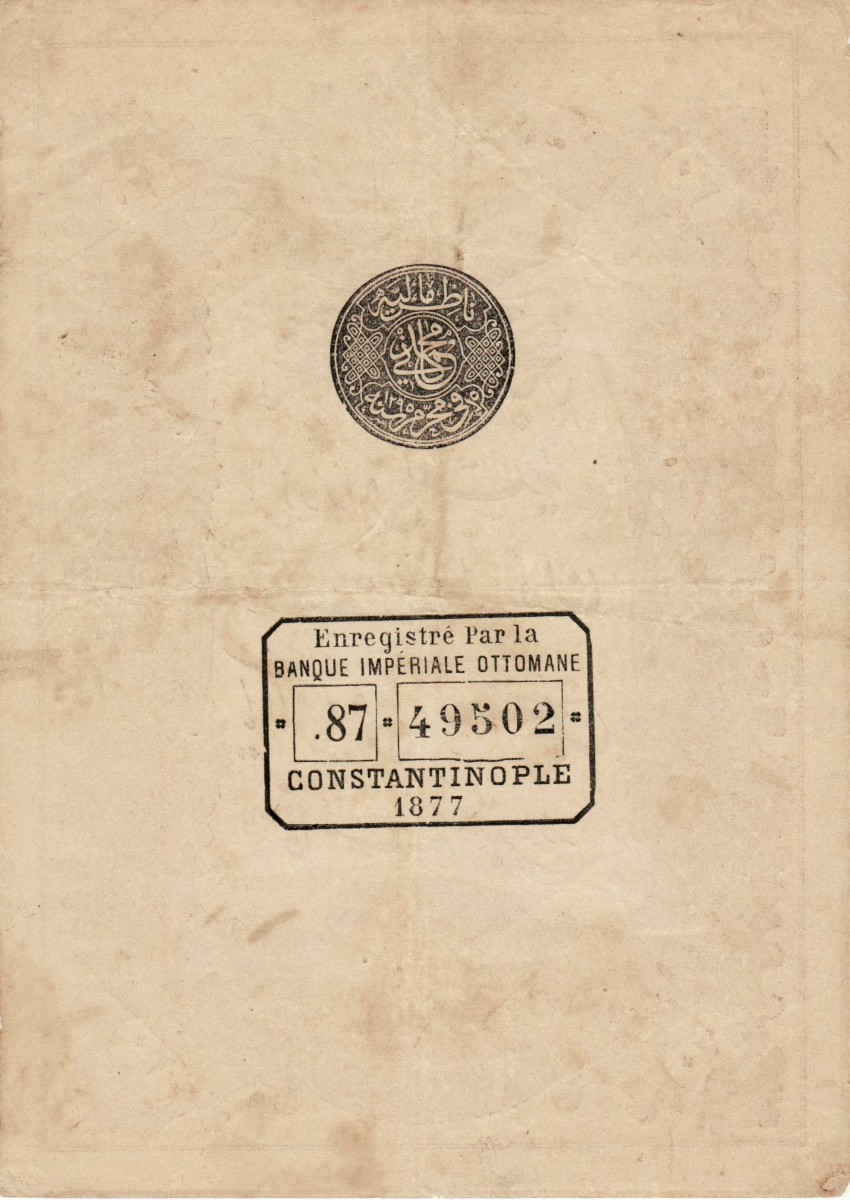 RS: rundes Siegel schwarz mit 1295 und rechteckigem Stempel schwarz: Enregistré par la / BANQUE IMPERIALE OTTOMANE, 87 – 49502, CONSTANTINOPLE / 1877