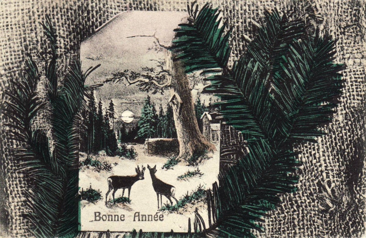 RS: Kitschbild, 2 Rehe, Vollmond Waldlandschaft etc, bonne Année