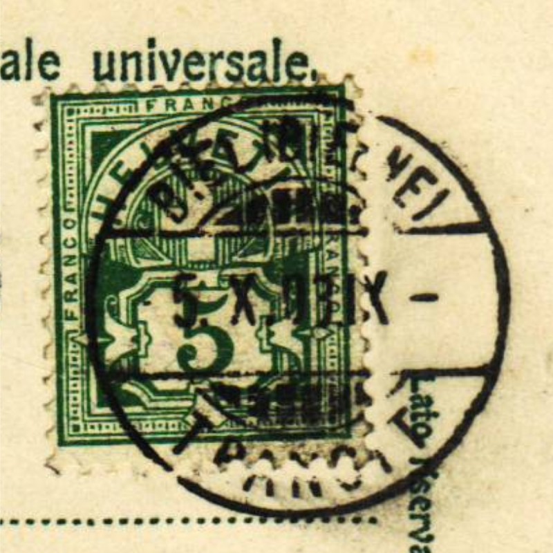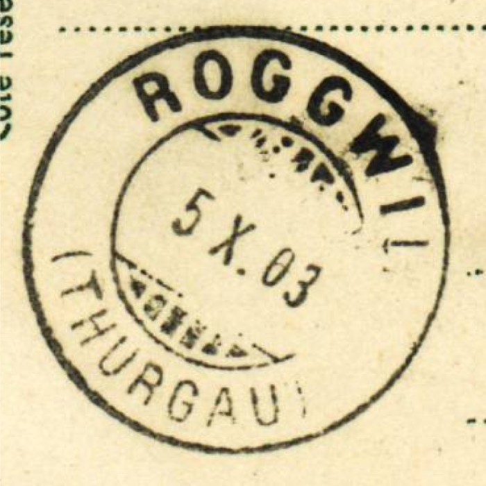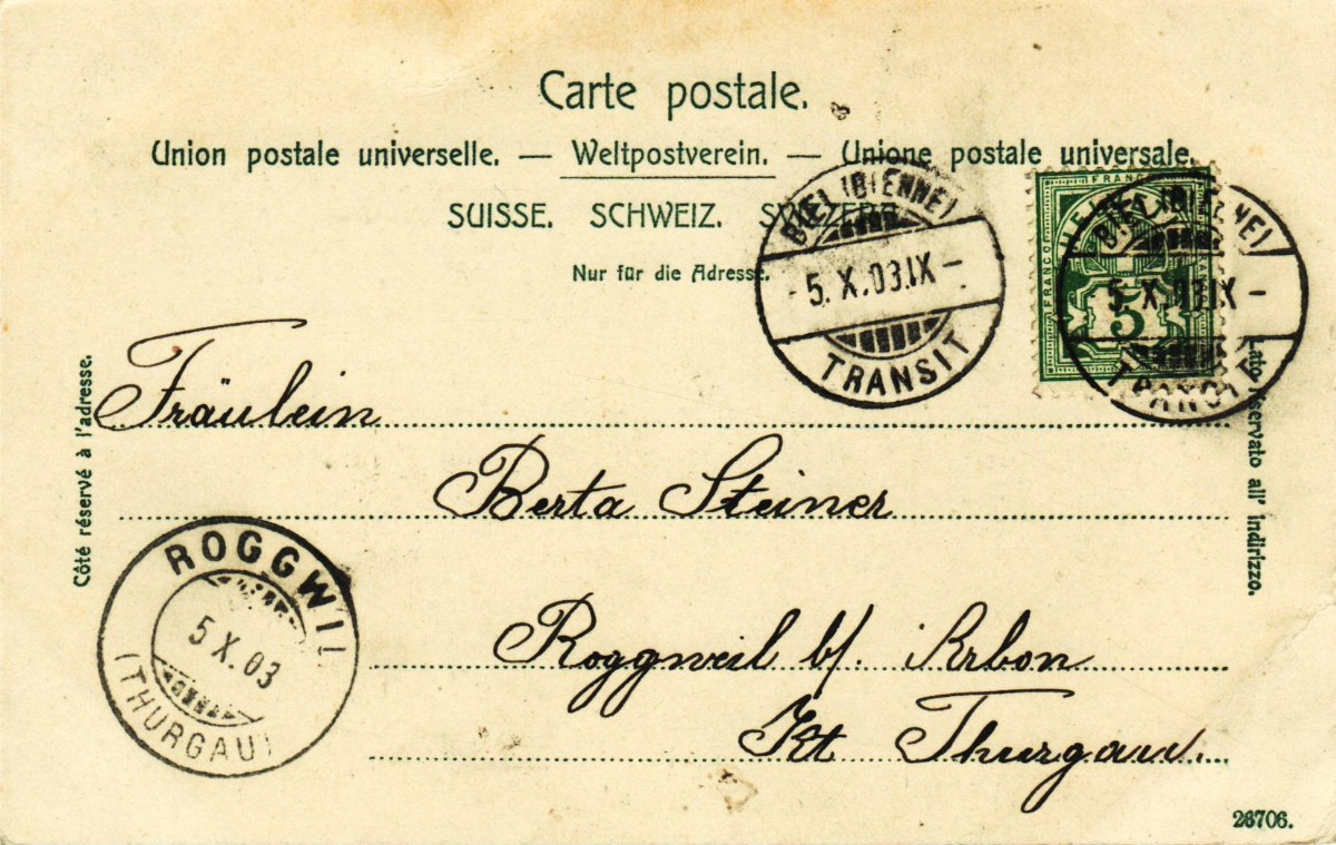 AS: Ziffermarte 5 Cts grün Z 65 B, vor 1900, ⦿ BIEL (BIENNE) – TRANSIT, -5.X.03.IX- nach ROGGWIL ( THURGAU), 5.X.03, Karten Nr: 26706