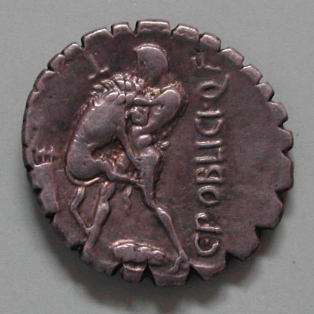 RS: C•POBLICI•Q F, Herkules erwürgt den Nemaeischen Löwen, oben T, unten Keule