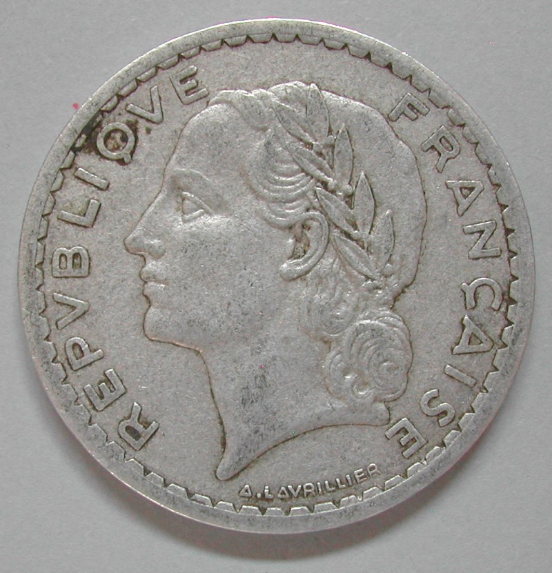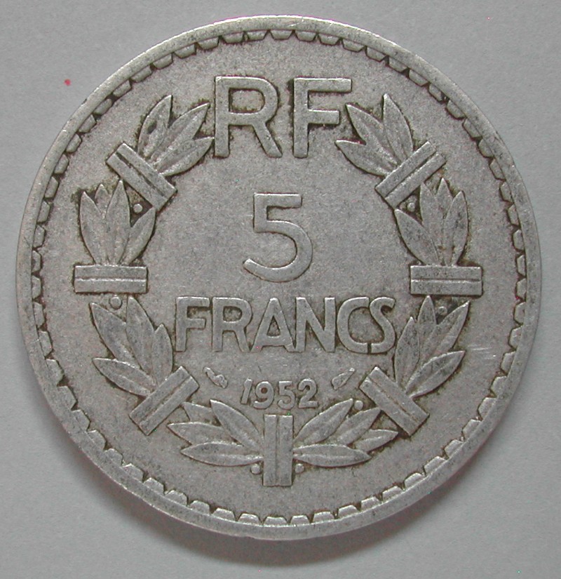 RS: RF / 5 / FRANCS / 1952 im Lorbeerkranz, unten ohne Mz
