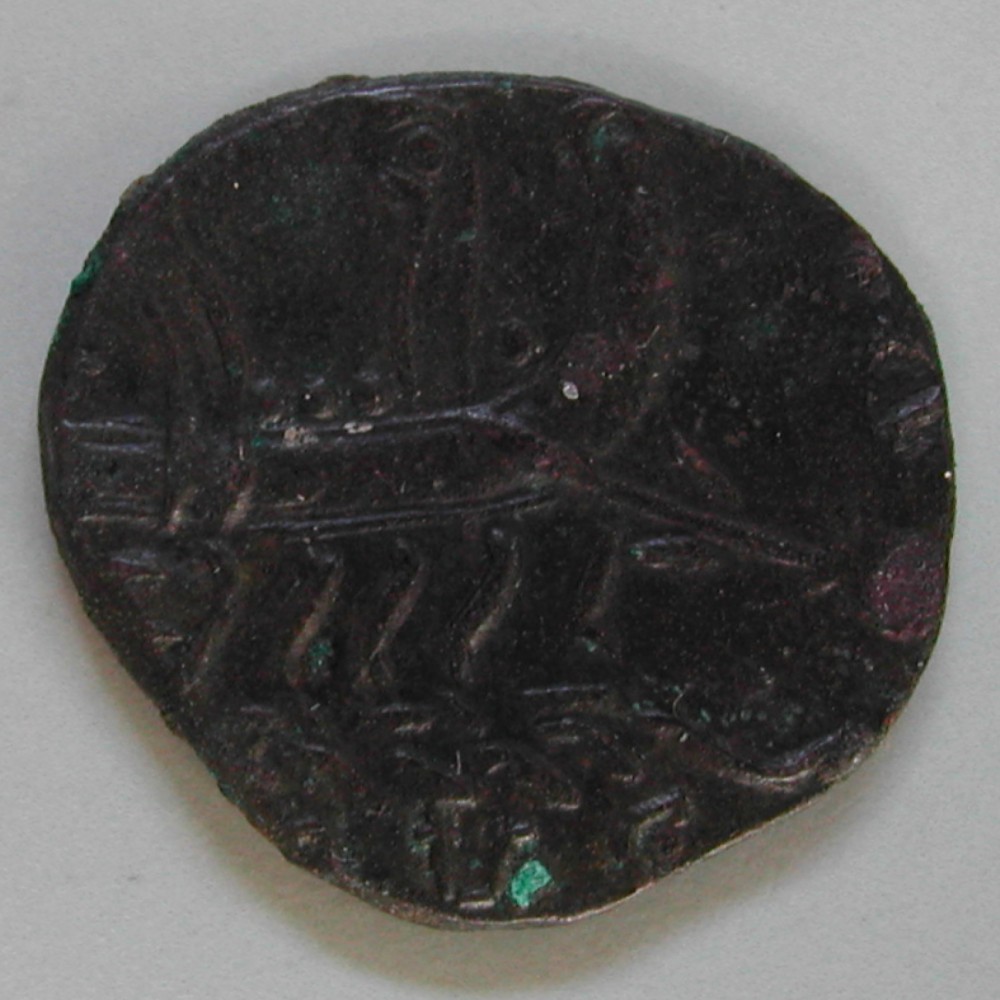 RS: Galeere nach rechts oder links mit langem Frontstachel oder Steuerruder?, stehende Figur auf Deck