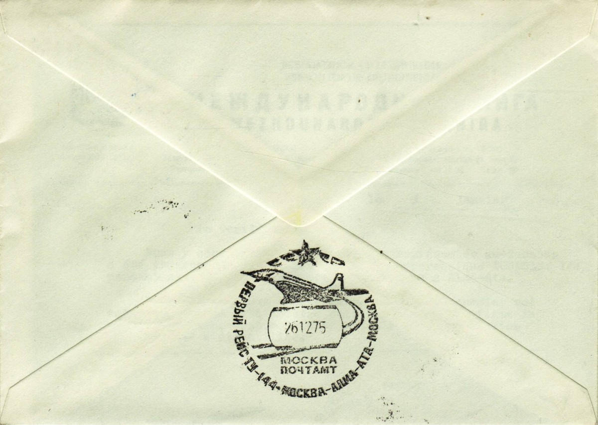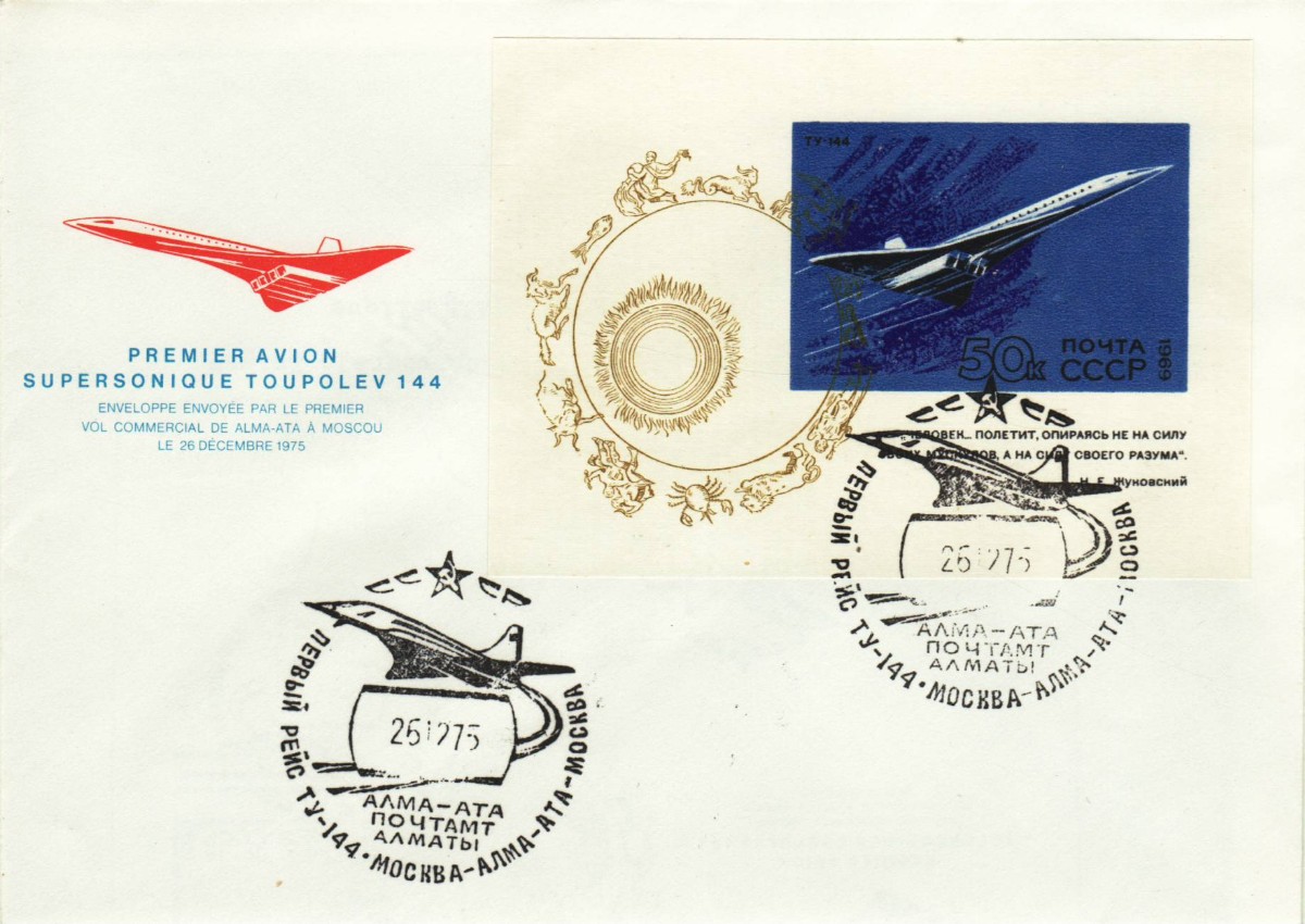 AS: Tupolev 144 nach links und Text, Sonderblock 50K CCCP mit Stempel ALMA-ATA