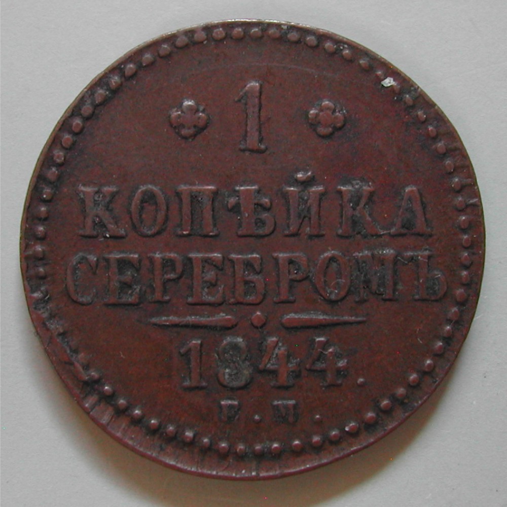 RS: ✤ + ✤ / KOPEKE / SEREBROMB (?) / 1844. / ―•― / F. M., feiner Perlkreis