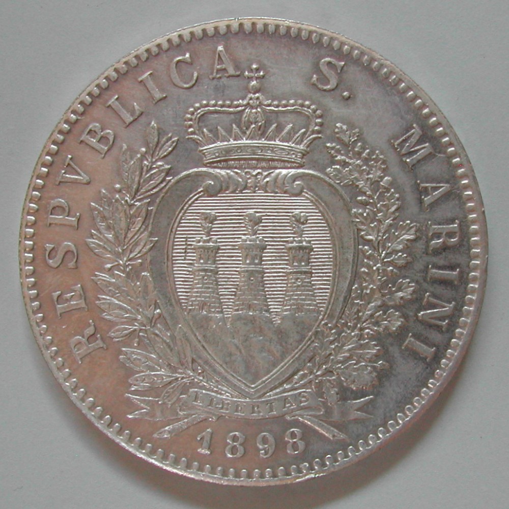 AS: RESPVBLICA S. MARINI, gekröntes Wappen zwischen Zweigen, unten: 1898