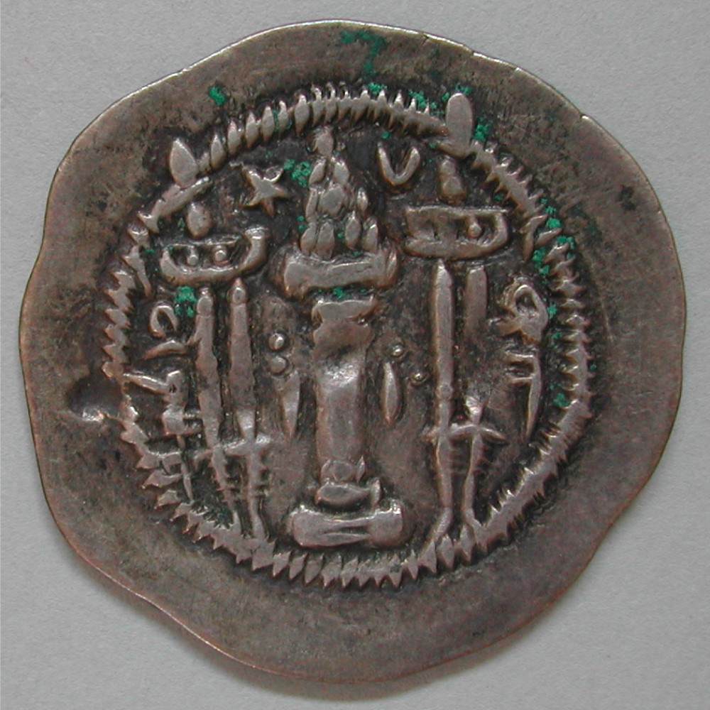RS: Feueraltar (Zoroastro), links und rechts Wächter stehend (stilisiert), ☽ + ✭, arabische Schriftzeichen