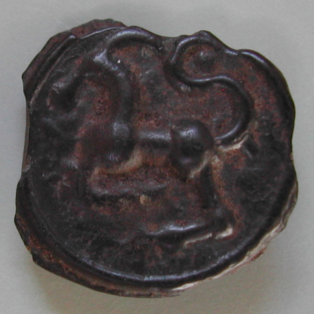 RS: Lauftier (Pferd?) nach links mit langem Schwanz geschweift darin Kugel