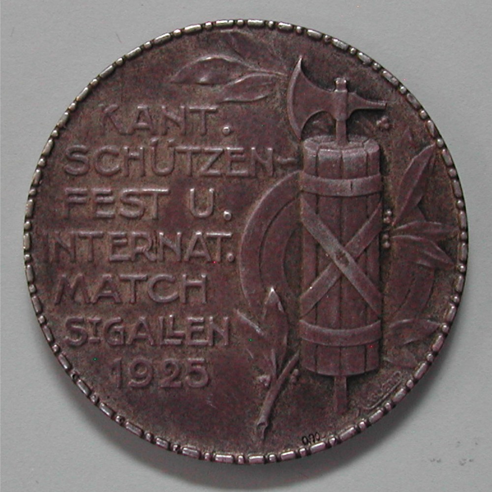 RS: KANT. / SCHÜTZEN- / FEST U. / INTERNAT. / MATCH / ST GALLEN / 1925, rechts: Fasces, Scheibe, Lorbeer, unten: 0.900, sig: HUGUENIN