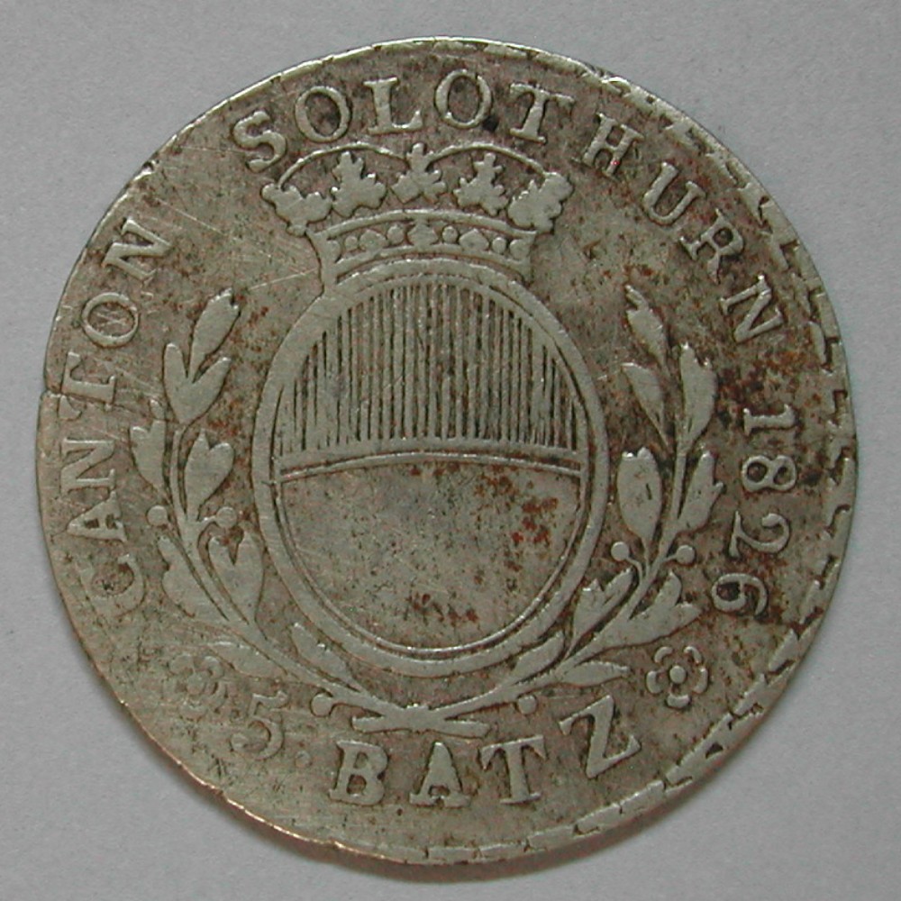 AS: CANTON SOLOTHURN 1826 ❀ 5 • BATZ ❀, gekröntes, ovales Wappen zwischen Lorbeerzweigen