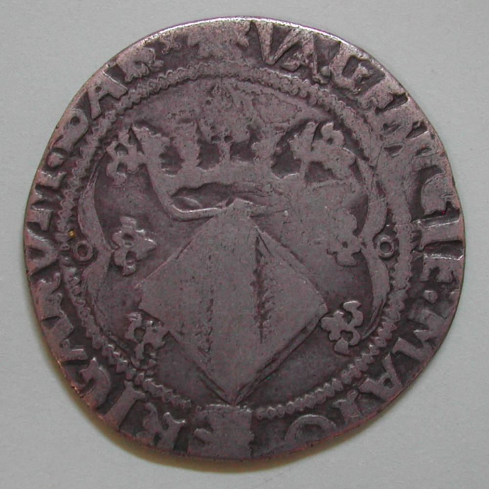 RS: VALENCIE • MAIORICARVM • BAR X, Krone über Wappen mit Guirlanden, Strichelkreis