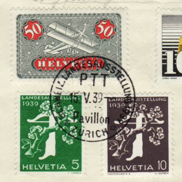 AS: Flugpost 50 C, Z Nr 9z, Postauto 10 C. und Landi 30 C. italienisch! + Serie Landi Armbrust 4 Stk, alle mit ⊙ SCHWEIZ LANDESAUSSTELLUNG ✚ ZÜRICH ✚, PTT / 15.V.39 / Pavillon, blauer Sonder-⊙: SWISSAIR-EUROPAFLUG ✚ NORD ✚, Flugzeug / Schweizerische / Landesausstellung / a939 und ☉ ZÜRICH 1 ★ BRIEFVERSAND ★, ✚ / 21.V.39 – / VIII