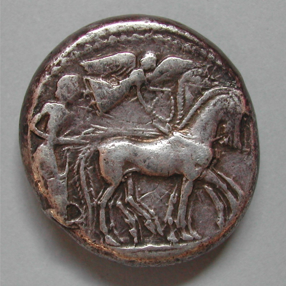 RS: Biga nach rechts mit Wagenlenker und oben fliegender NIKE