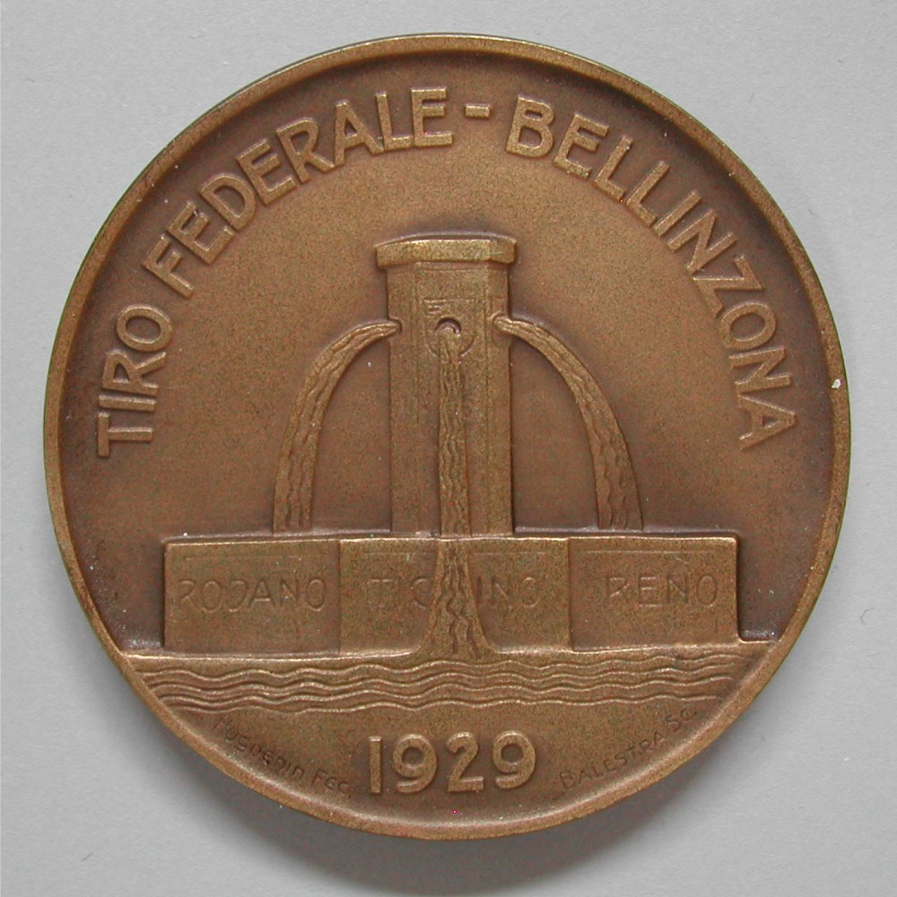 AS: TIRO FEDERALE-BELLINZONA, Brunnen mit Inschrift: RODANO TICINO RENO / 1929, sig: HUGUENIN FEC. – BALESTRA SC.