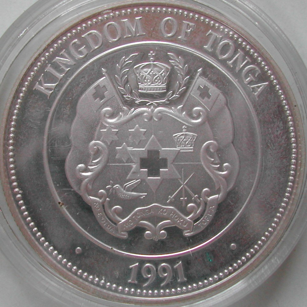 AS: KINGDOM OF TONGA • 1991 •, gekröntes Wappen im Linienkreis