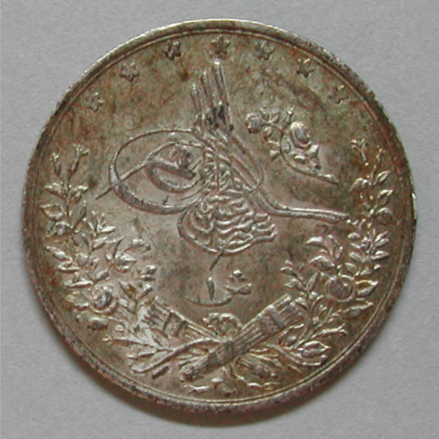 AS: 7 *, Toughra (Sultans Signatur), rechts Rose unten 1 sh (SCH) für Qirsh, links und rechts Blumenzweige