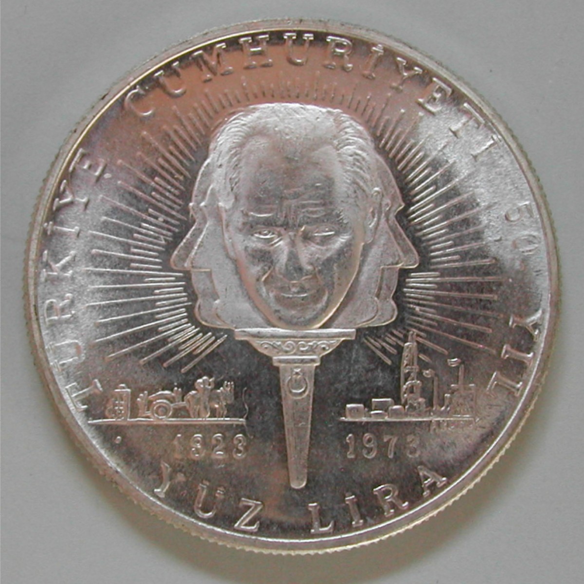 AS: TÜRKIYECUMHURIYETI • 50 • YIL • YÜZ LIRA •, Atatürks Kopf von 3 Seiten mit Strahlenmeer, 1923 – 1973, sig: A.KUNUK