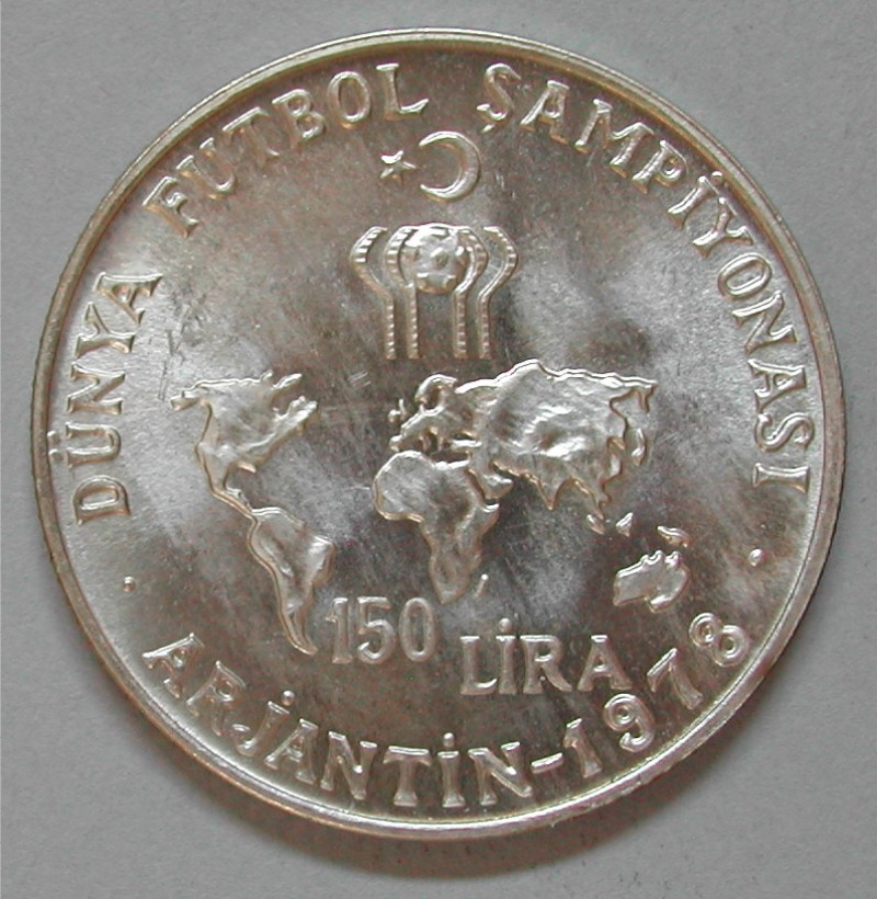 AS: DÜNYA FUTBOL ŞAMPIYONASI • ARJANTIN-1978, Embleme und Weltkarte, 150 LIRA