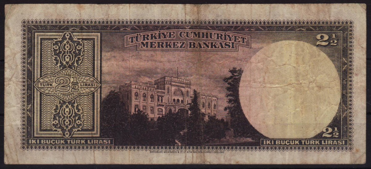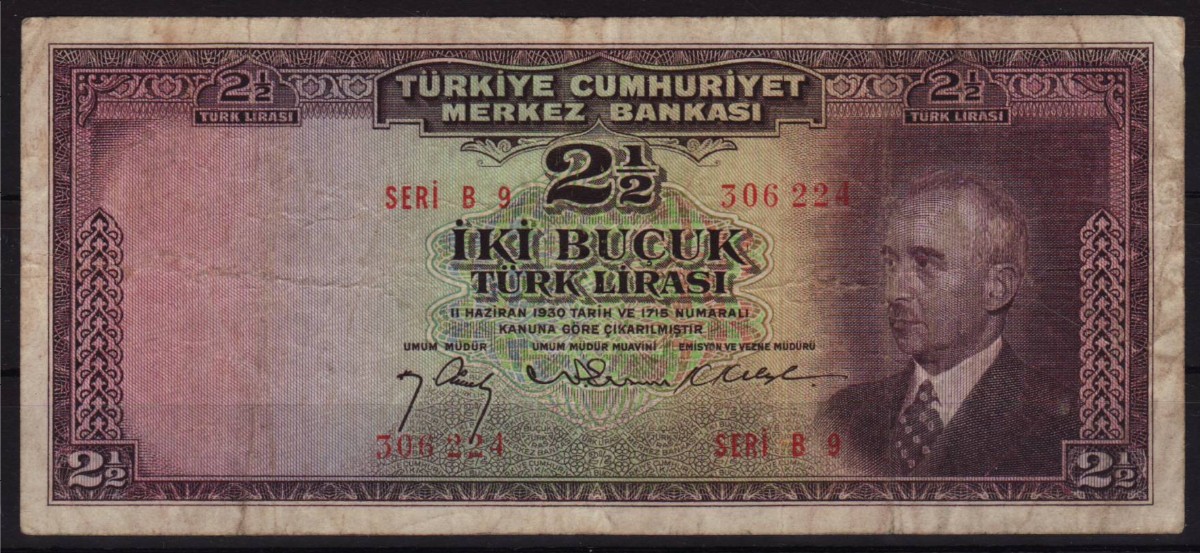 AS: TÜRKIYE CÜMHURIYET / MERKEZ BANKASI, 2½ / IKI BUCUK / TÜRK LIRASI, rechts: Kopf von Inönü nach links, SERI B 9 306 224