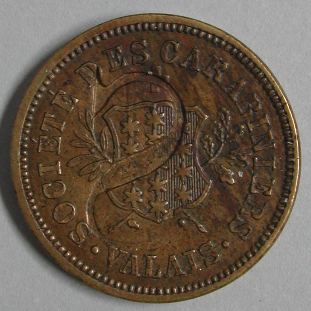AS: SOCIÉTÉ DES CARABINIERS ● VALAIS ●, Wappen vor Lorbeer.und Eichenzweigen, S retro senkrecht eingepunzt