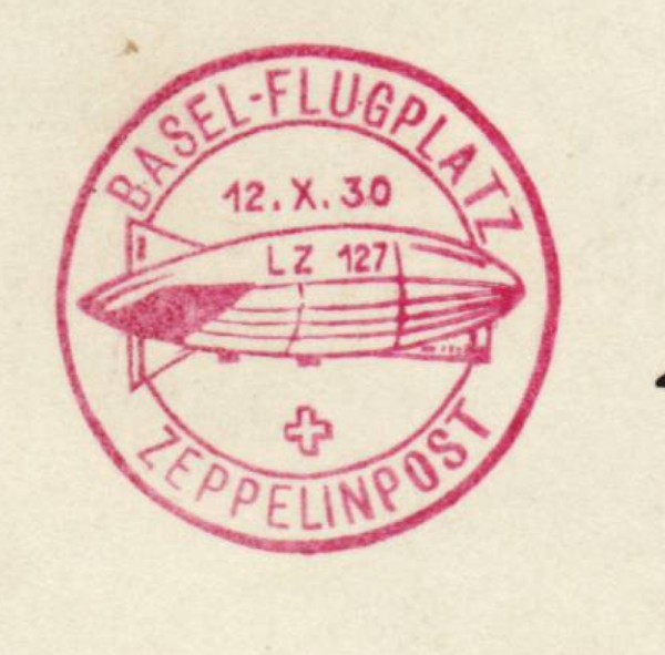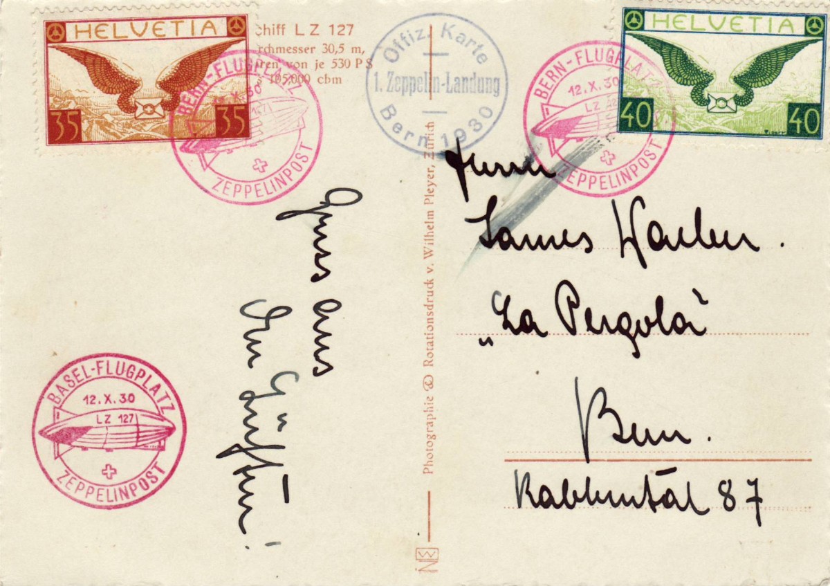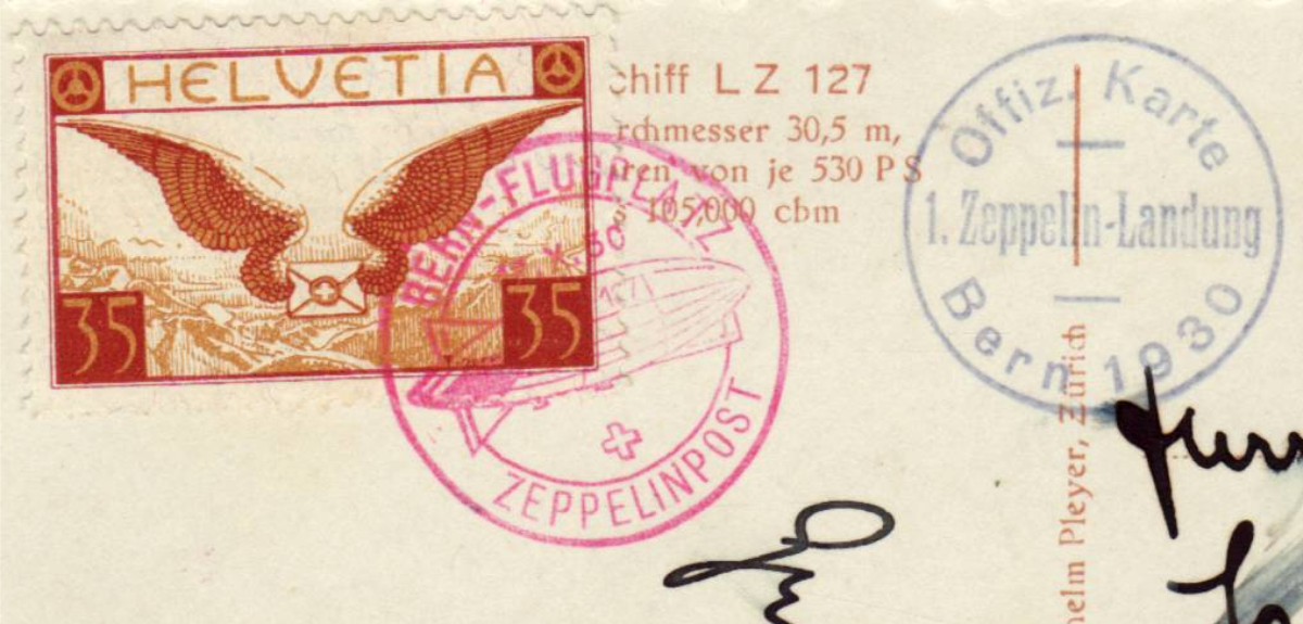 AS: Frankatur Flugpost 35 C. Z 14z und 40 C. Z 15 z, blauer ☉ Offiz. Karte 1. Zeppelin-Landung Bern 1930, ☉rot BERN-FLUGPLATZ ZEPPELINPOST, 12.X.30 / LZ 127 / ✚ UND ☉rot BASEL-FLUGPLATZ ZEPPELINPOST, 12.X.30 / LZ 127 / ✚