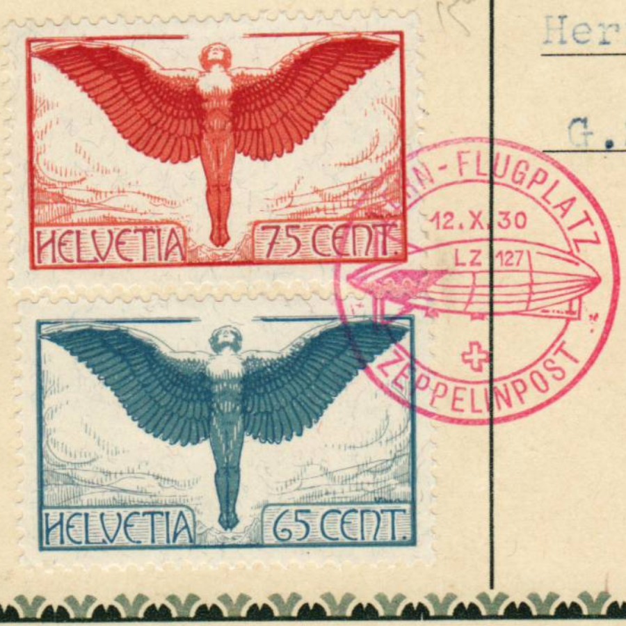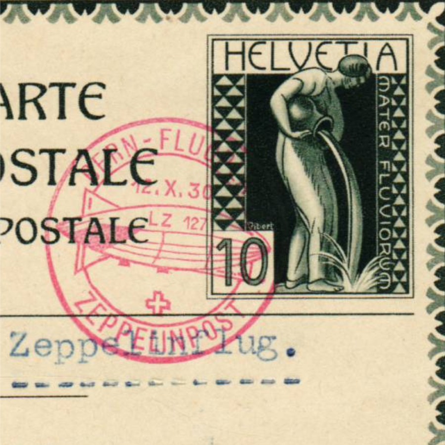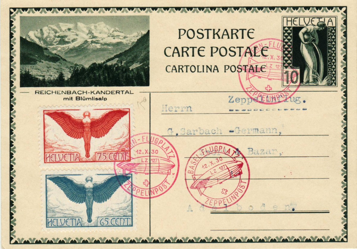 AS: Bildpostkarte, GS 10 C. MATER FLUVIORUM, Zusatzfrankatur Flugpost IKARUS 65 C. Z 10 z und 75 C. Z 11 mit roten ☉ BERN-FLUGPLATZ ZEPPELINPOST, 12.X.30 / LZ 127 / ✚ und ☉ BASEL-FLUGPLATZ ZEPPELINPOST, 12.X.30 / LS 127 / ✚